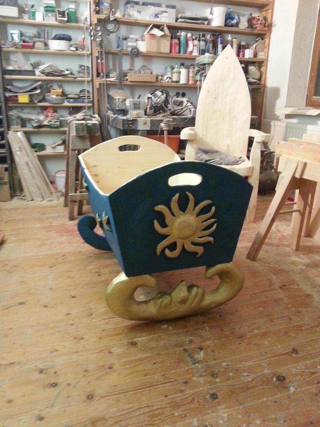 Wiege, Holz, geschnitzt, farbig gefasst, teilvergoldet, (Arbeitsfassung), 2013