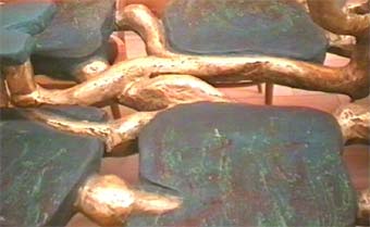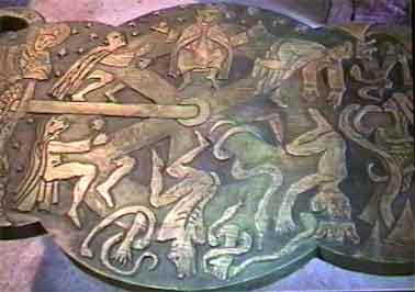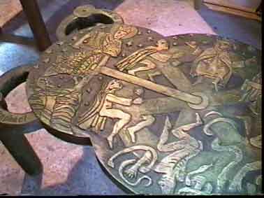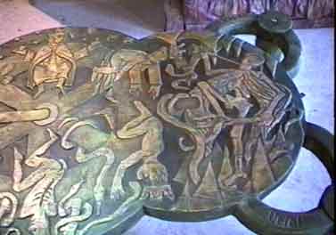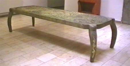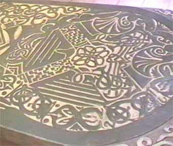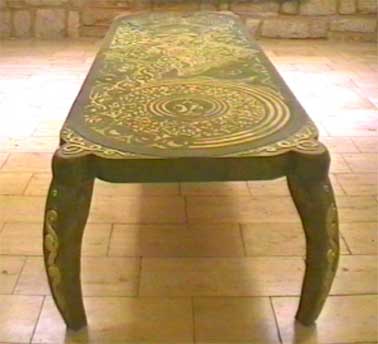 Keltische Tafel, Tanne, farbig gefasst, Reliefschnitzerei, teilvergoldet, 300cm x 100cmx 76 cm, 1999