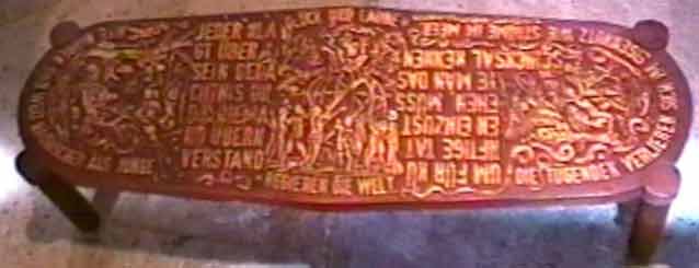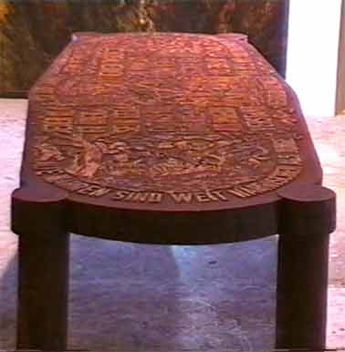 Schicksalstisch, Detail, Holz, Reliefschnitzerei, Länge 190 cm, Breite 100 cm, Höhe 75 cm, 2000