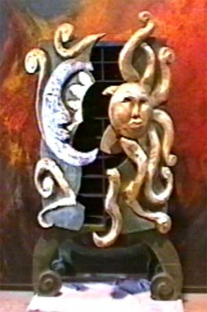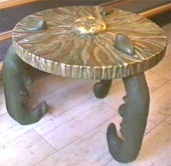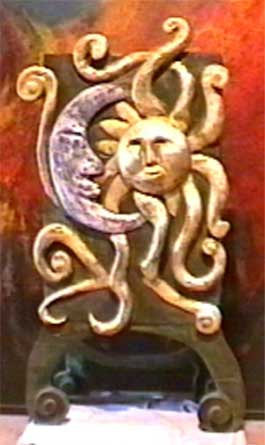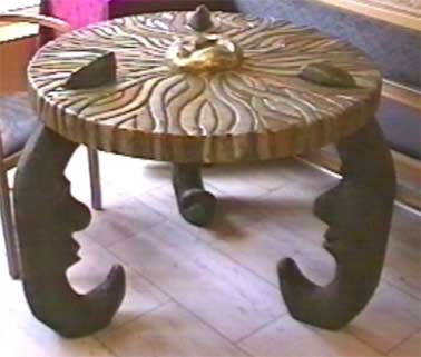 Sonne mit drei Monden, Tisch, Tannenholz, geschnitzt, farbig gefasst, teilvergoldet, Höhe 76 cm, 1999