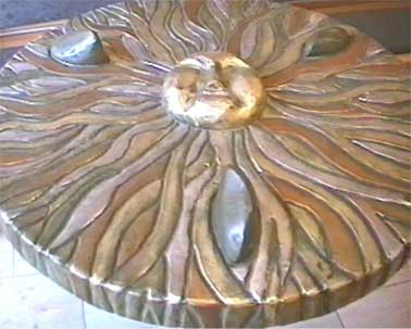 Sonnentisch, Tanne, Reliefschnitzerei, farbig gefasst, teilvergoldet, 200 x 100 x 76 cm, 2000