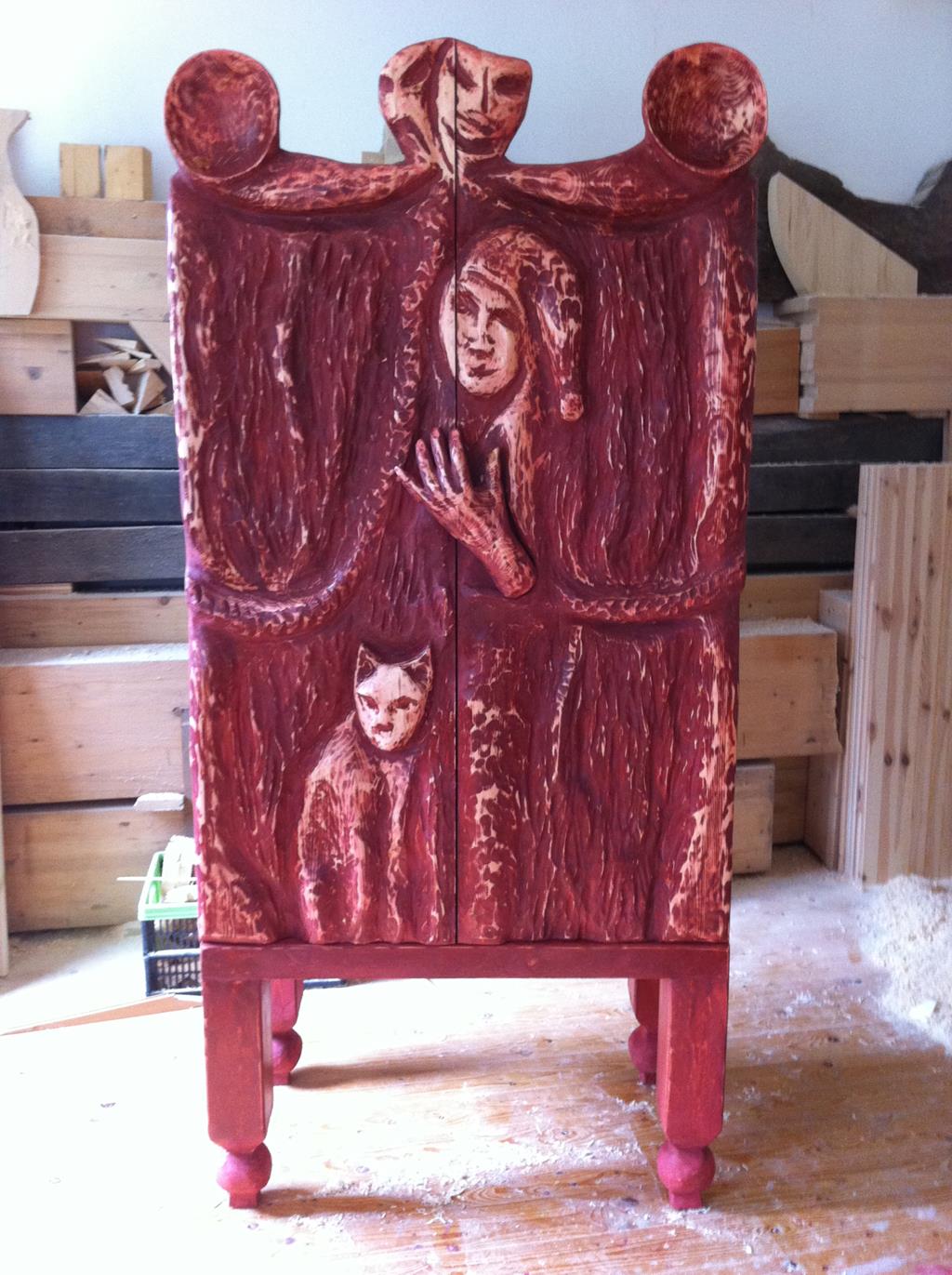 Die alte Dame, Schrank, Holz, geschnitzt, Höhe 240 cm, 2001