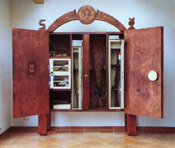 Waffenschrank, Tannenholz, geschnitzt, farbig gefasst, Höhe 260 cm, Breite 240 cm, 1999