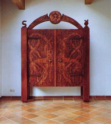 Sonne-Mond-Tabernakel, Tannenholz, geschnitzt, Farbig gefasst, teilvergoldet, Höhe 195 cm, 1998
